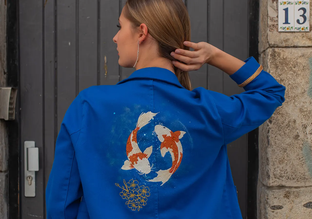 Nous avons échangé ensemble sur son projet afin d’égayer sa veste de manière sobre et élégante. Inspirées par la culture japonaise, l’idée de broder deux jolies carpes ornées de sequins et de perles au centre du dos nous a conquise. Brodées sur une peinture textile légère, discrète, aux reflets pailletés qui laisse imaginer les ondes de l’eau. A la demande de ma cliente j’ai complété la composition avec un bouquet de Sakura, fleur emblématique du Japon. A l’avant de la veste, le rappel d’une carpe brodé en plus petit sur une des poches ainsi que l’ajout d’une galon sur le revers de cette veste et les poignets. J’ai adoré sublimer cette veste et en faire une pièce unique !